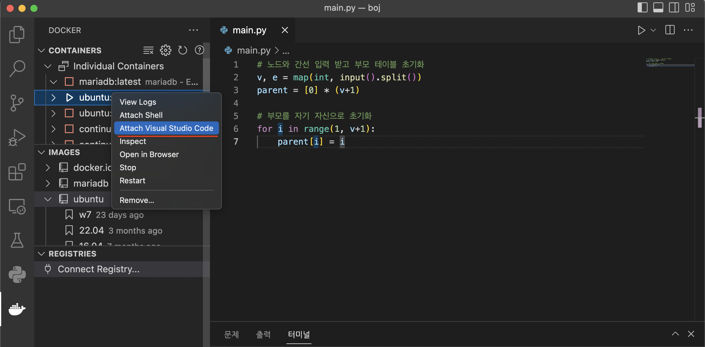 사용할 도커 컨테이너를 터미널에서 작동시키고, vsc를 통해 접속하면 된다.