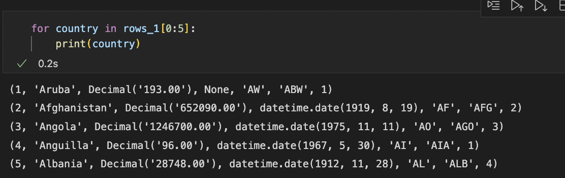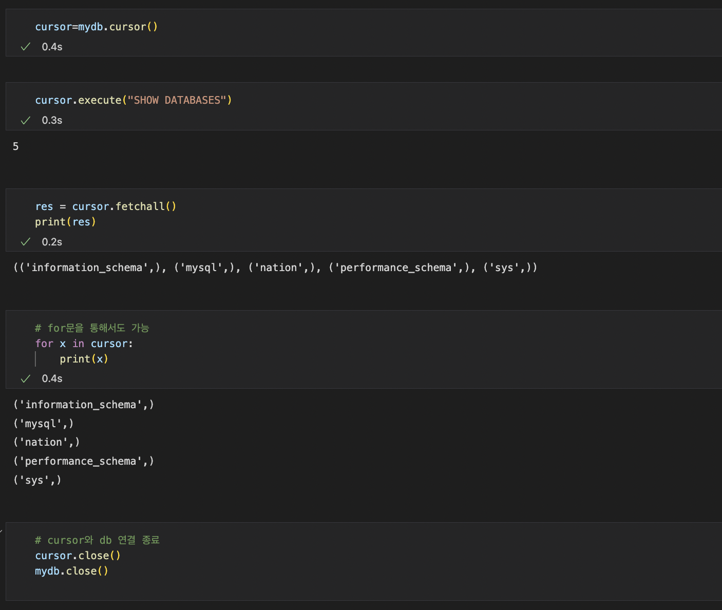 cursor()를 통해 튜플로 값을 잘 반환해주는 걸 확인할 수 있다.