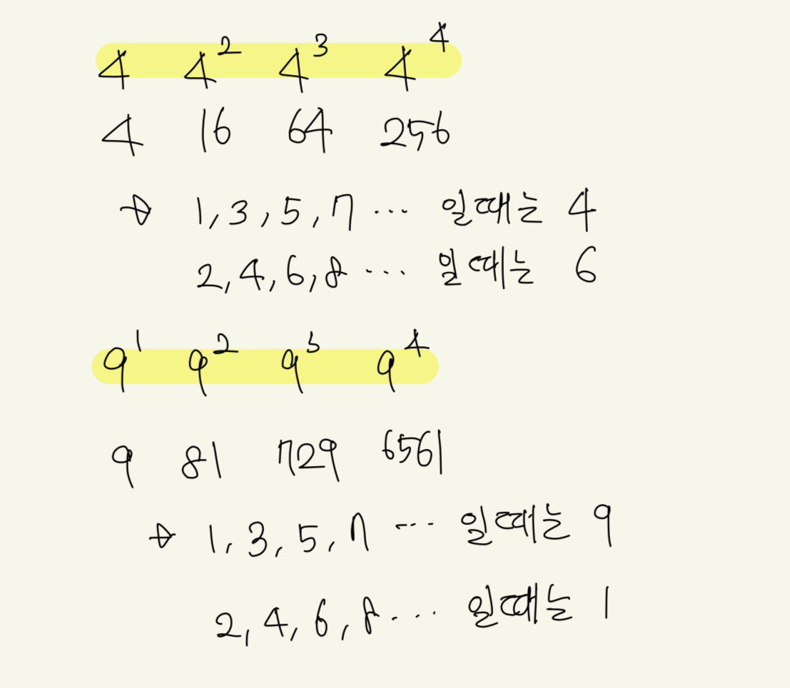 - 2 번씩 반복되는 값들은 승수를 홀,짝으로 나누어서 계산. 만약 짝수라면 a 자체가 아닌 a*a 값이므로 a*a%10