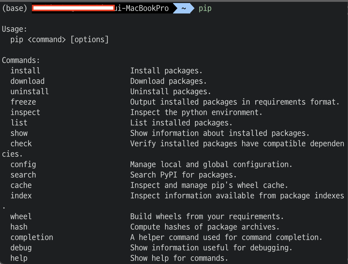 아래와 유사한 결과값이 출력되면 pip는 잘 설치되어 있는 것이다. 만약 pip가 설치되어있지 않다면 Python 버전을 업그레이드 하거나, pip를 직접 설치하면 된다.