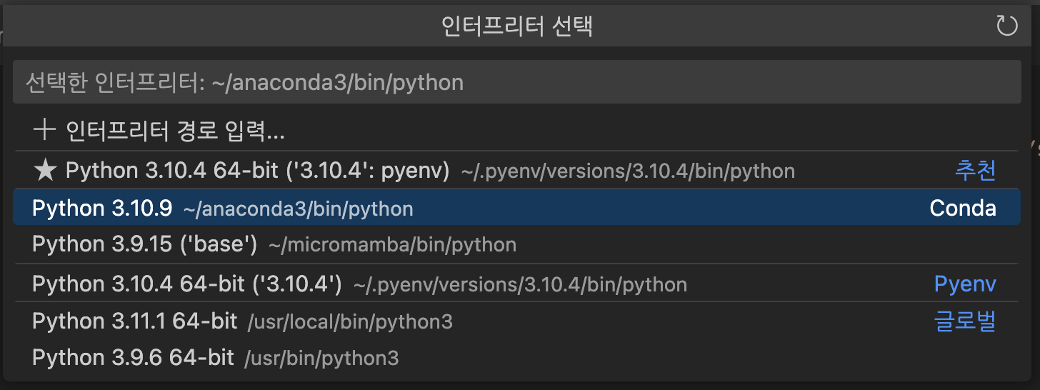 라이브러리는 버전 간 공유되지 않으므로 라이브러리를 설치한 파이썬 버전과 실행할 파이썬 버전을 맞춰주는 것이 중요하다. VSC 오른쪽 아래에서 내가 작업할 프로젝트의 Python 버전을 선택할 수 있으므로, 내가 설치한 라이브러리와 버전, 경로가 맞는 파이썬 버전을 선택하여 사용하자.