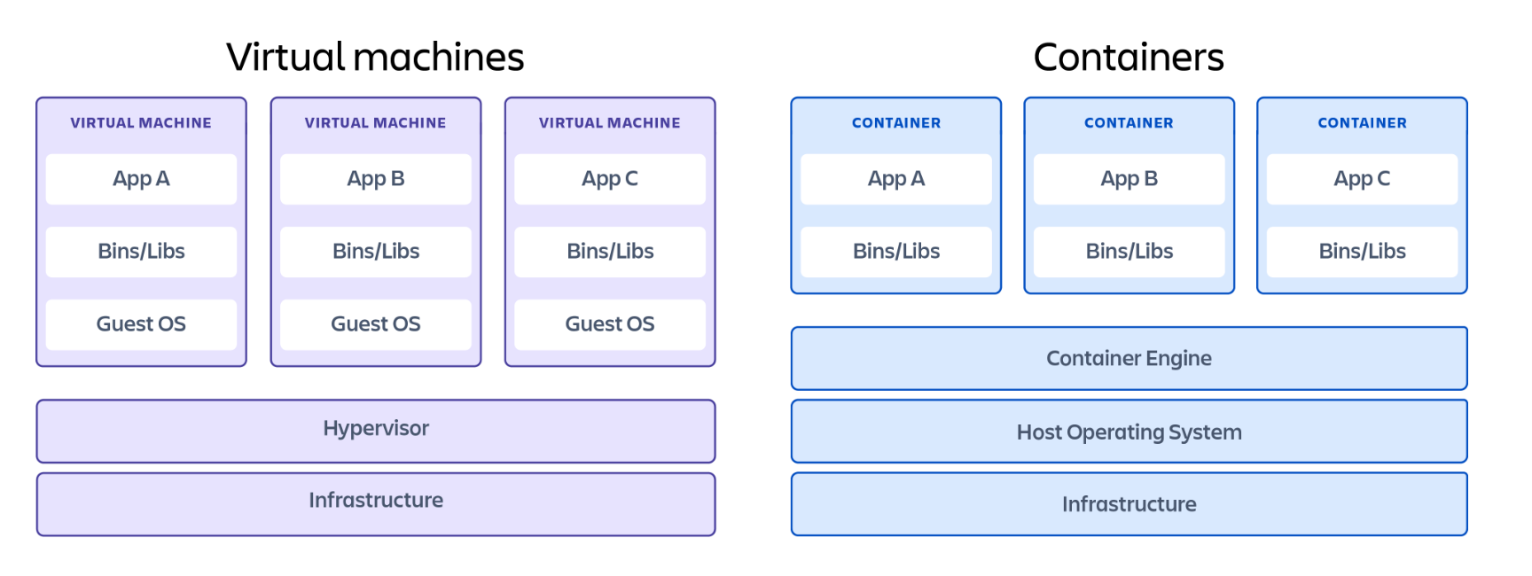 | OS | Host OS 위에 Guest OS를 복제해서 사용(RAM, CPU 등등 모두) | 애플리케이션 동작에 필요한 dependencies들만 패키징하고있음 -> Host OS 공유 |
