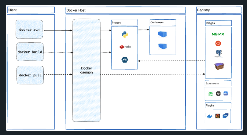 도커 아키텍처를 보면, 도커를 사용하는 개발자가 도커 명령어를 작성하는 것은 도커 데몬측으로 요청을 날리는 것이다.