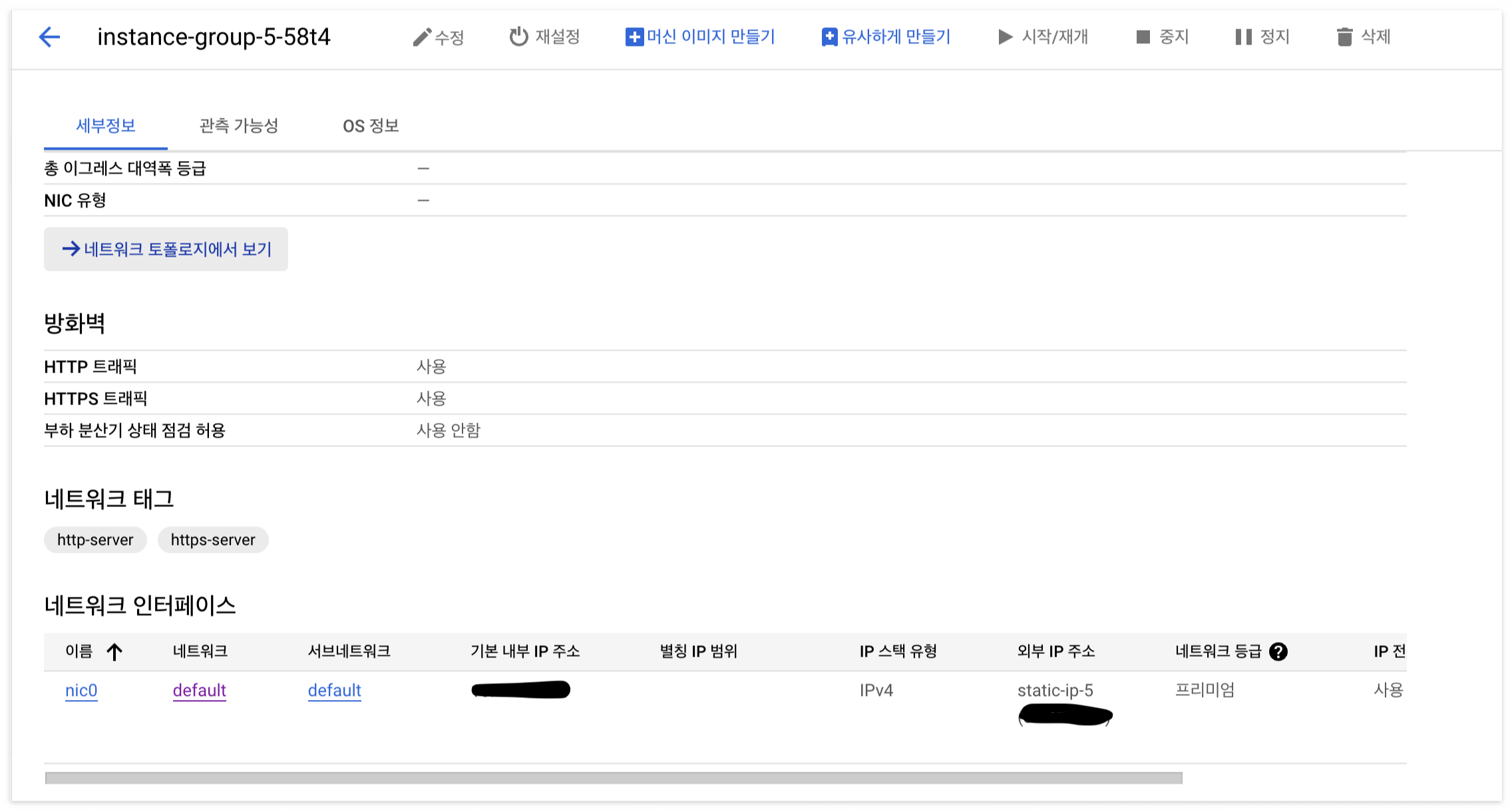 인스턴스 템플릿에 정의된 내용대로 인스턴스 그룹을 생성했기에, 외부 IP 주소에는 인스턴스 템플릿에서 정의한 IP 주소가 잘 담겨있는 것을 확인할 수 있다.