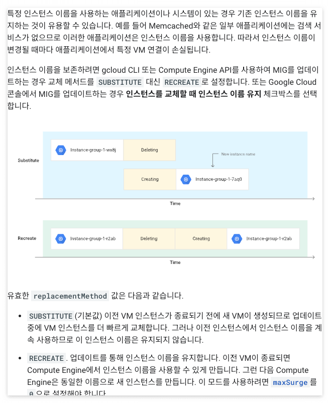 - SUBSTITUE 방식은 기존 인스턴스를 삭제를 함과 동시에 새로운 인스턴스를 만들기 때문에 시간이 단축 가능과 무중단 배포가 가능한 대신 이름과 ip가 변경된다.