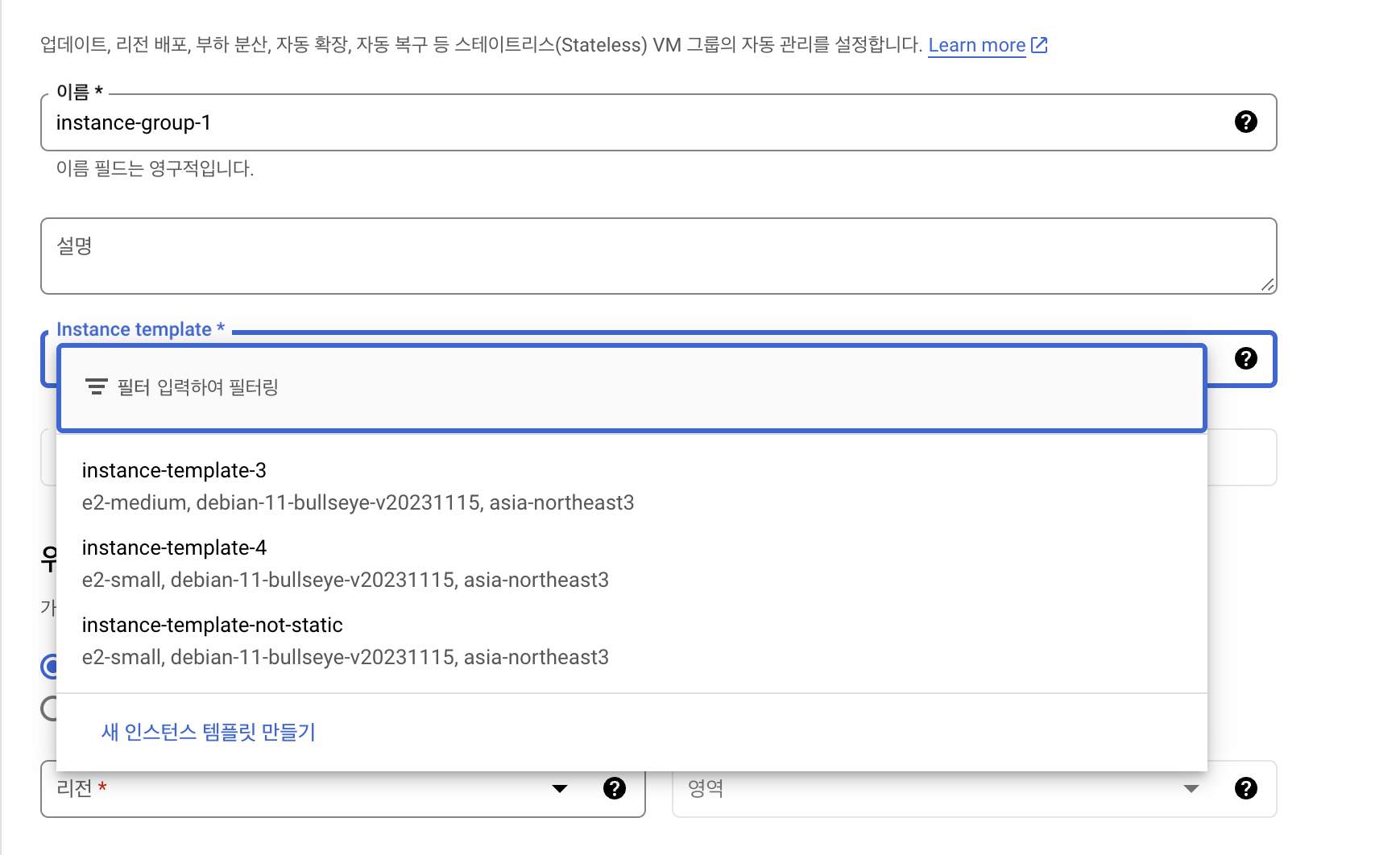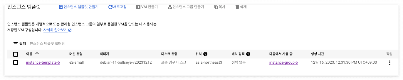 앞서 설명했듯, Instance Group은 인스턴스 템플릿에 의해 생성된다. 그래서 인스턴스 그룹 만들기를 하면 위와 같이 템플릿 옵션이 나온다. 이렇게 인스턴스 그룹을 만들면 VM 인스턴스를 관리하고 확장하기 쉽다.
