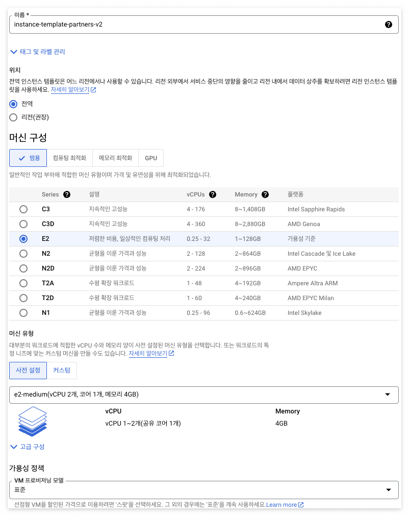 - 위 템플릿 관리 페이지 경로로 접속하여 인스턴스 템플릿 만들기를 통해서 정의할 수 있다.