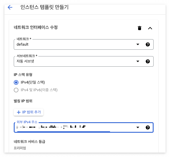 템플릿을 생성할 때 고정 외부 IP를 쓰기 위해서 VPC > 네트워킹에서 고정 ip를 생성한다. 이후 인스턴스 템플릿을 정의할 때 위와 같이 할당만 해주면 된다. 고정 외부 ip를 생성하는 부분은 이 포스팅에서는 생략하도록 한다.