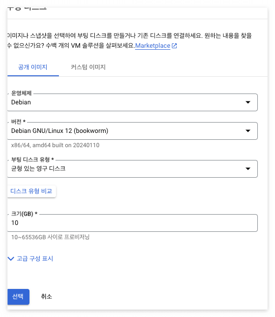 부팅 디스크는 원하는 운영체제와 버전, 크기를 세팅한다.