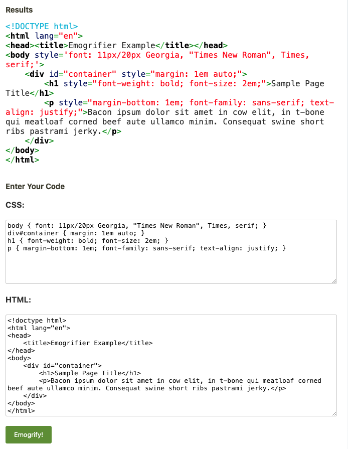 아래와 같이 CSS 코드와 HTML 코드를 붙여넣고, Emogrify 버튼을 누르면 Results에 자동으로 변환된 결과값이 도출된다.