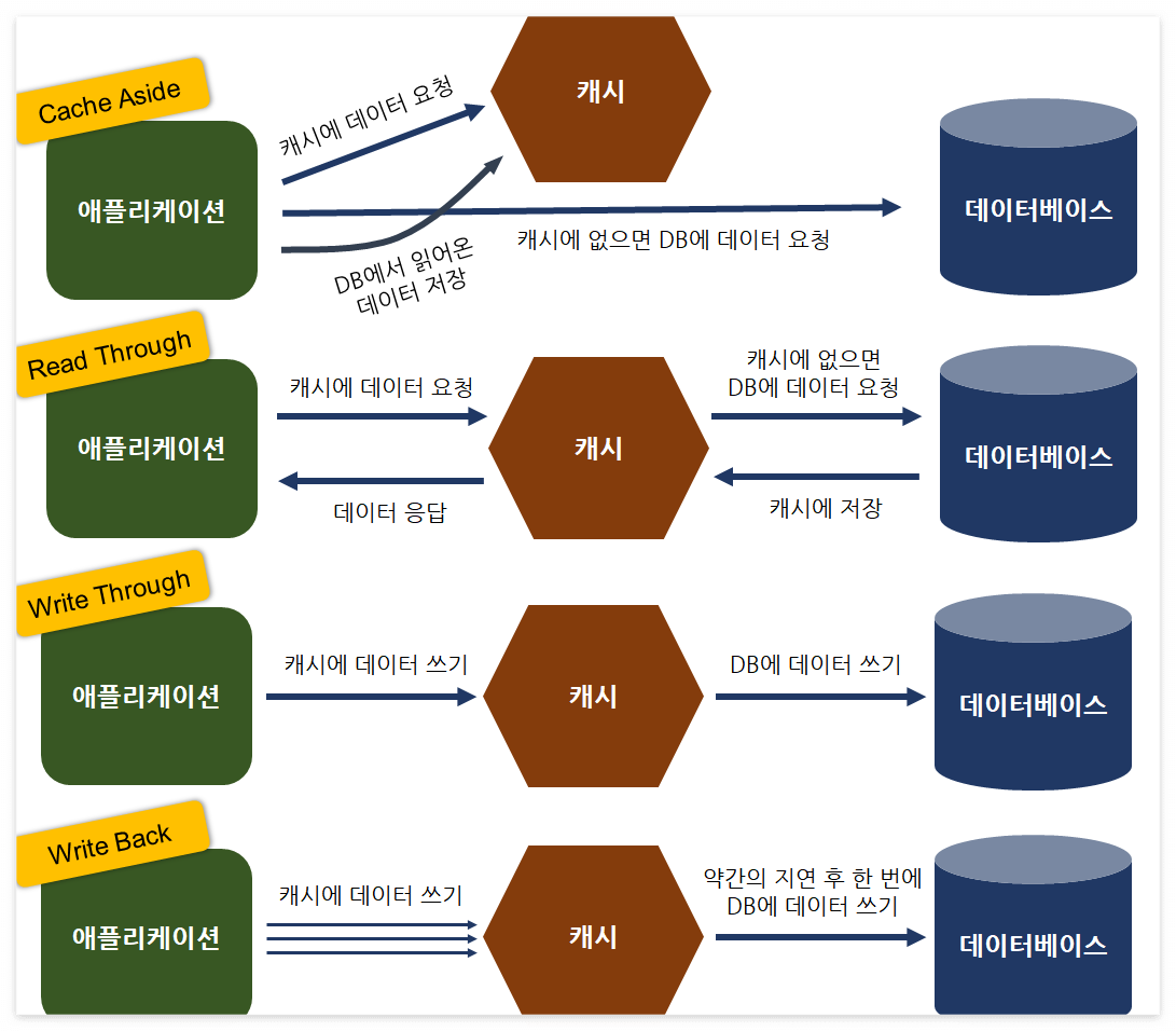 레디스 캐싱 전략은 크게 4 가지이다. 보통 읽기/쓰기 패턴을 고려하여 4 가지 전략 중 한 가지를 택하거나 2 가지 이상의 전략을 결합하여 사용한다.