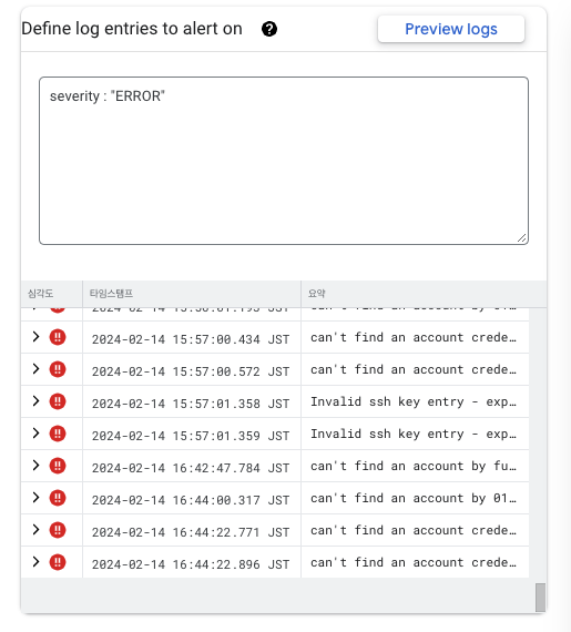 이제 ERROR 사항을 트리거하기 위해서 쿼리를 설정하는데, 크리티컬하지 않은 ssh key 관련 에러사항까지 모두 알림을 받게된다. 로깅 쿼리 작성을 통해 원하는 로그만 트리거할 수 있다.