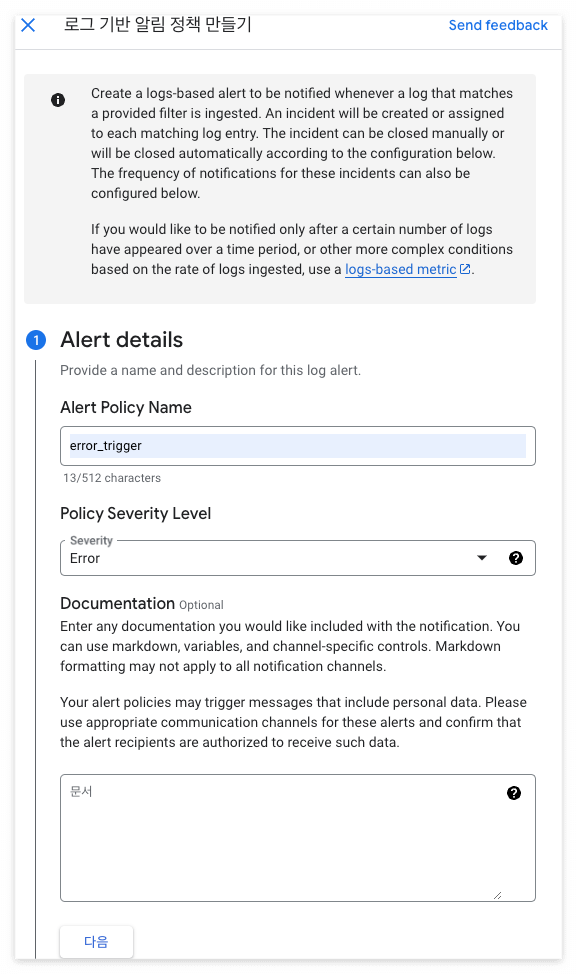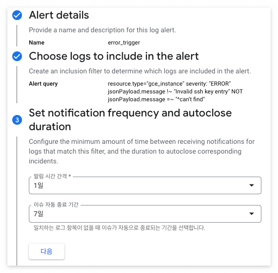 알림시간 간격을 설정할 수 있다. 또한 내가 설정한 에러가 발생하지 않으면 해당 이슈를 자동으로 종료하도록 설정할 수 있다. 일단 로그 알림이 잘 전송되는지 확인하기 위한 것이므로 하루 단위로 알림을 하되, 일주일 이내에 자동 종료를 하도록 설정해두었다.