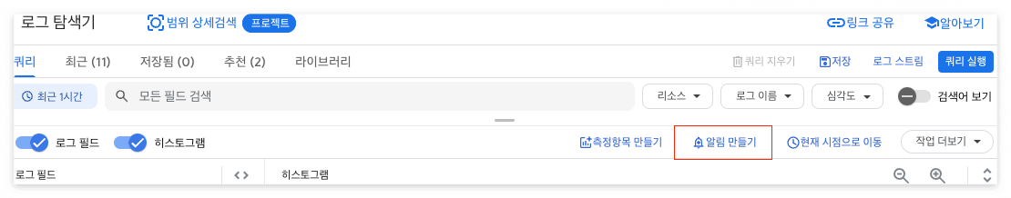 Cloud Logging의 가장 우측에 알림 만들기라는 버튼을 클릭하자.