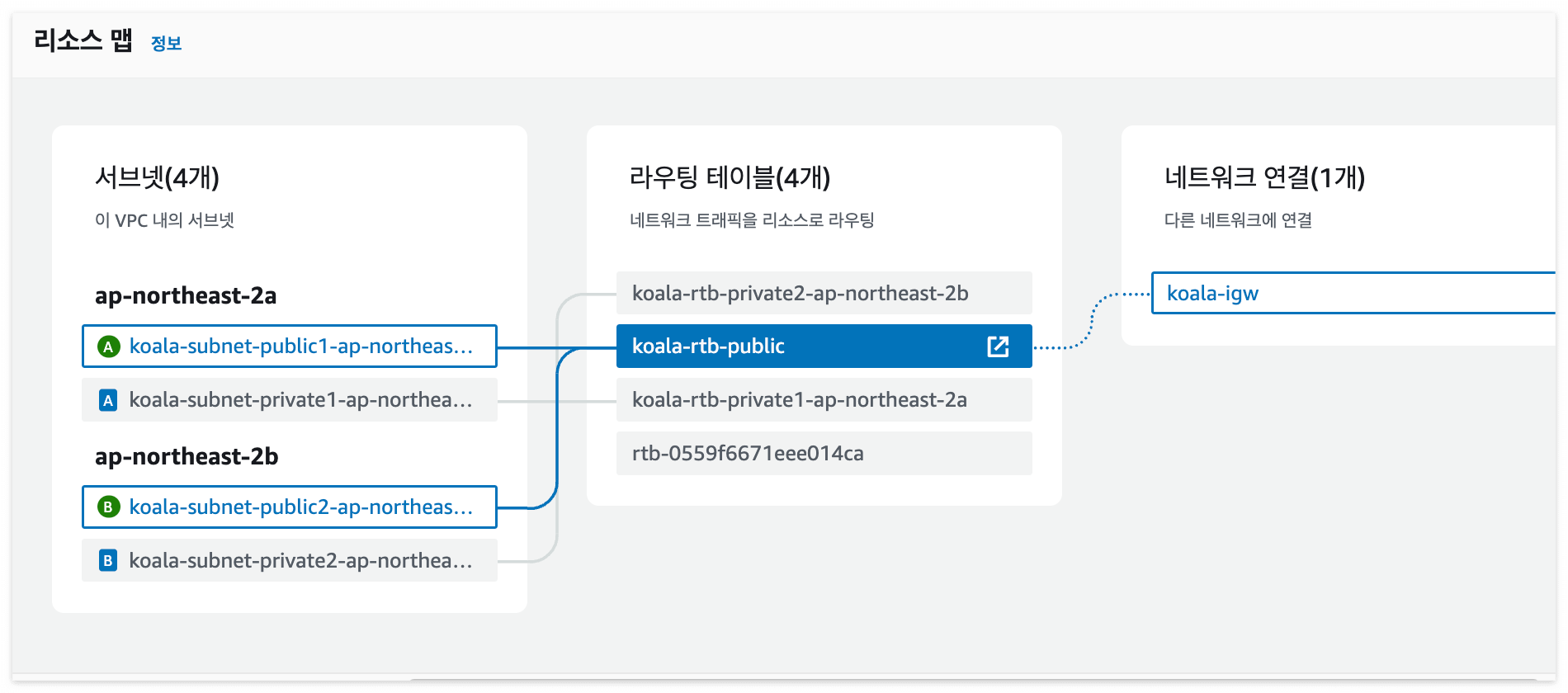 - 특히 public 라우팅 테이블은 두 개의 public 서버와 한 번에 연결되어 있다.