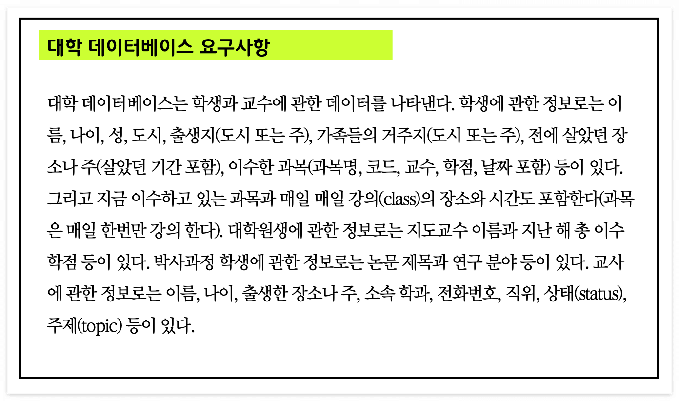 지금까지 과제에서는 DATABASE 설계 명목 하에 개체와 속성이 뚜렷하게 보이는 식으로 요구사항이 정의되었다.