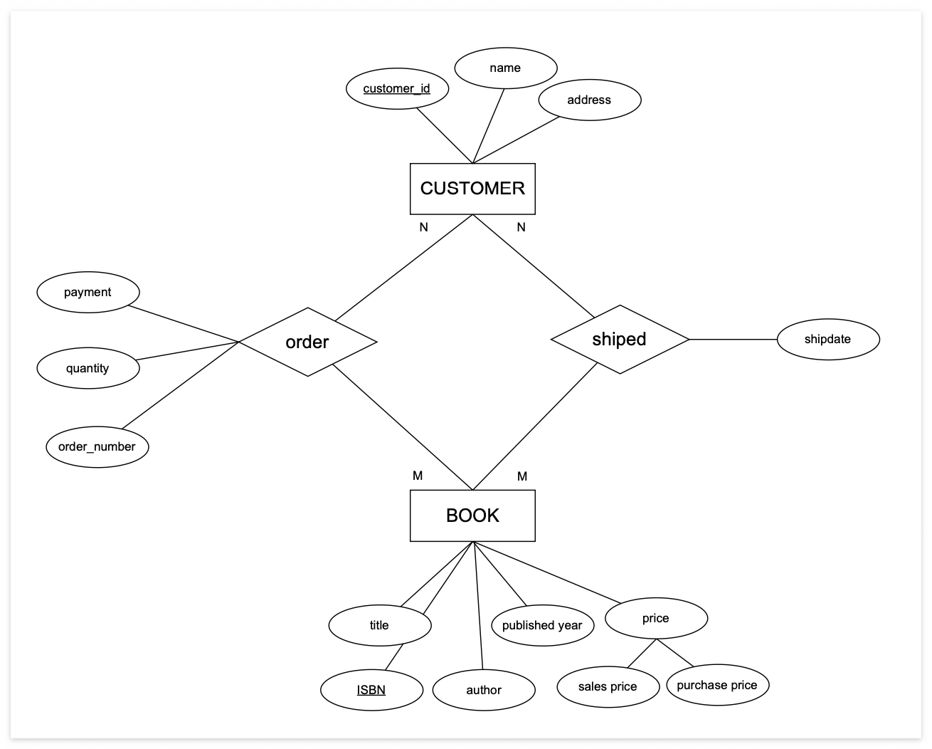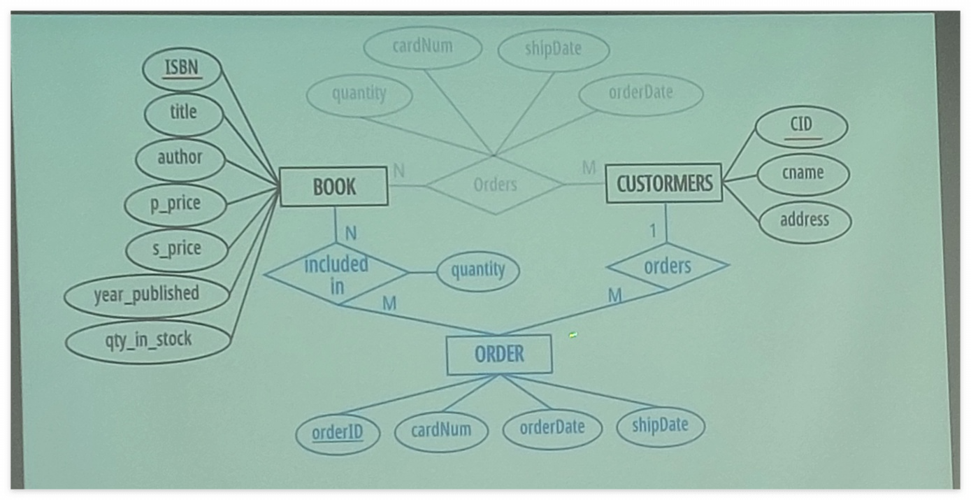 - 그런데 개체 간의 단순한 관계의 의미를 넘어서 응용 관점을 검토해보는 태도가 필요하다. 그러니까 위 설계같은 경우는 Customer와 Book 사이에 order라는 관계는 의미상으로는 완벽하다. 하지만 다음 질문에 답하기 어려운 설계다.