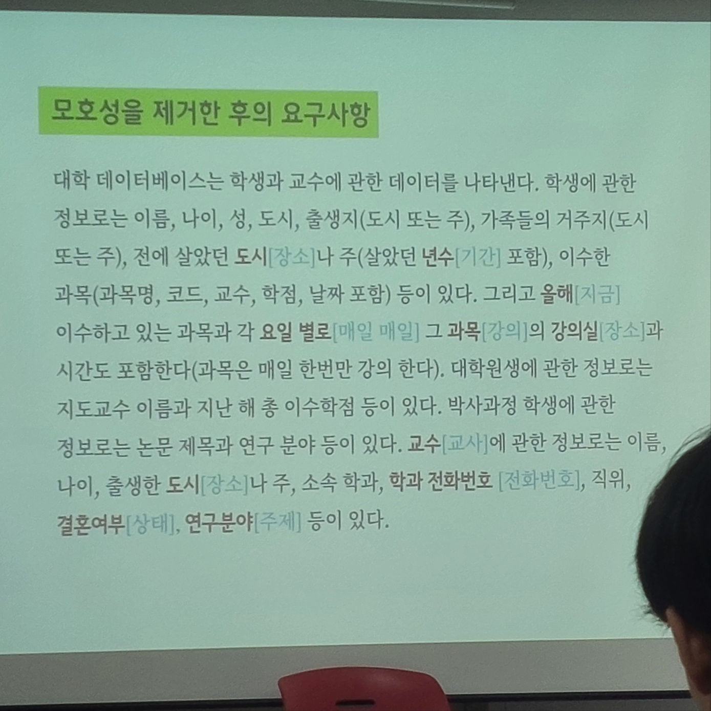 그런데 원래 요구사항은 대화하는 방식으로 주어진다. 이번 과제부터 자연어 요구사항이 주어졌고.. 이러한 경우는 "모호성 제거" 단계를 거쳐야 한다.