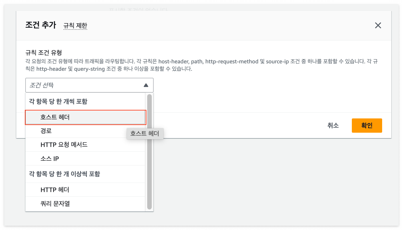 리스너 규칙은 다양한 조건을 추가할 수 있는데, 서브 도메인을 활용하여 트래픽을 분산할 것이므로 호스트 헤더를 정의한다.