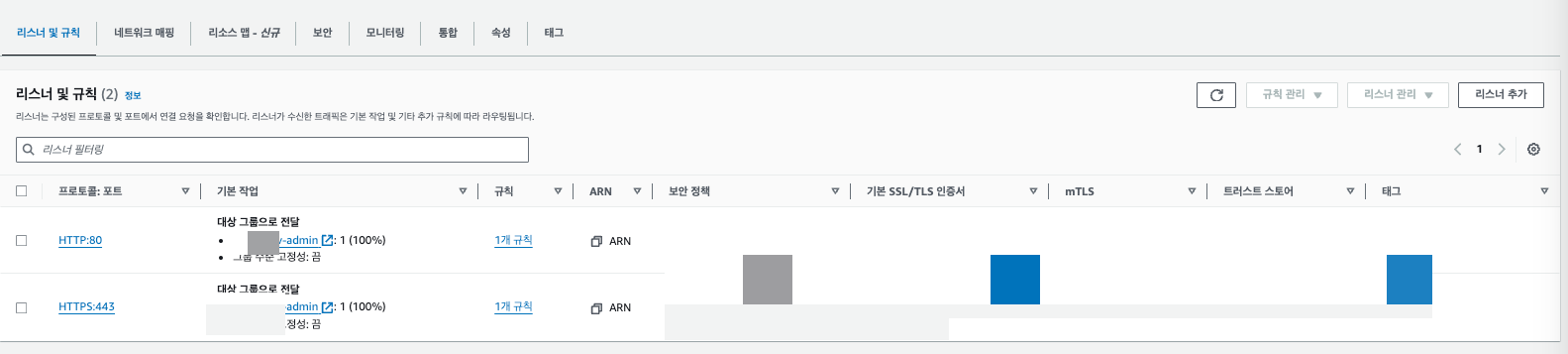 이렇게 리스너 규칙에 기본값으로는 admin, 추가된 조건으로는 HTTP 호스트 헤더가 user-main.example.com 인 대상을 user-tg가 있음을 확인할 수 있다.