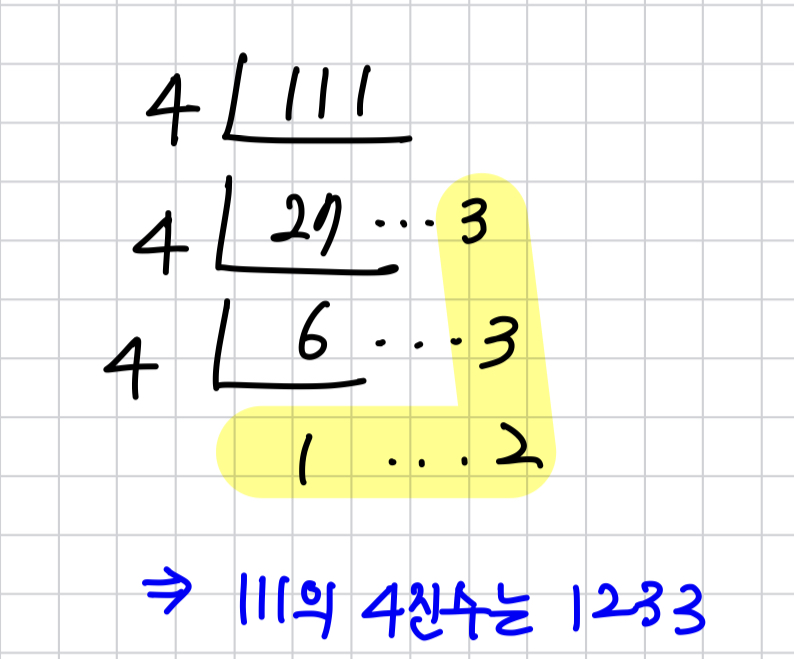 어떤 십진수가 있을 때 N진수로 변환하고 싶다면 위와 같은 계산 과정을 거친다. 이를 코드로 표현해주면 다음과 같다.