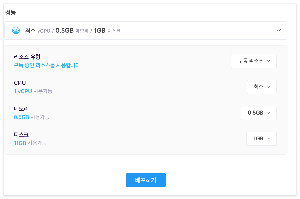 마지막으로 성능을 선택해준다. cloudtype은 무료료 제공하는 CPU와 메모리 수준이 있다. 만약 대용량 데이터를 담아야 하거나, 성능이 매우 좋은 DB를 써야 한다면 구독 플랜을 업그레이드 시켜주면 된다.