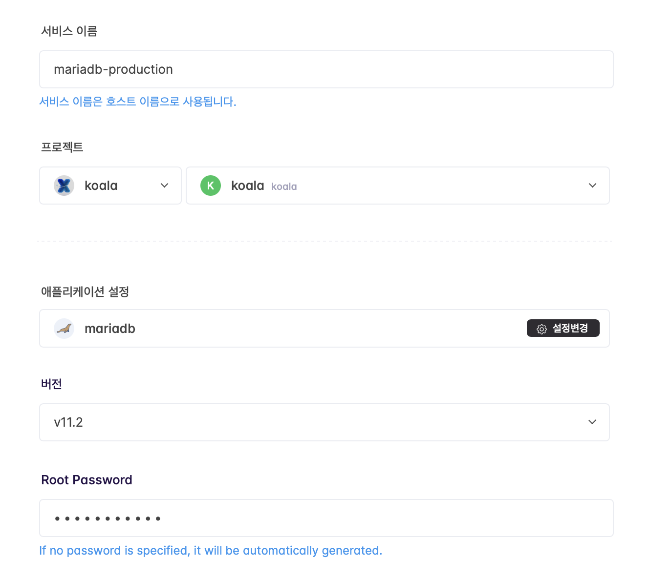 MariaDB를 검색해서 클릭하면, DB 세팅 화면이 나온다.