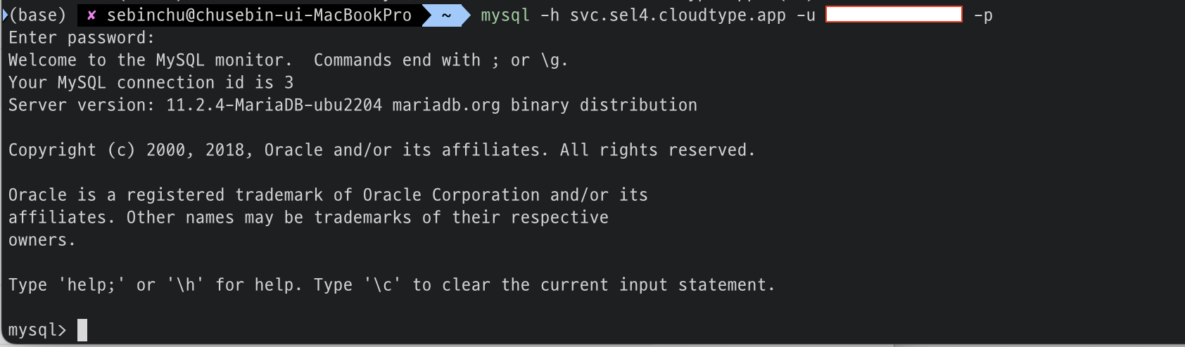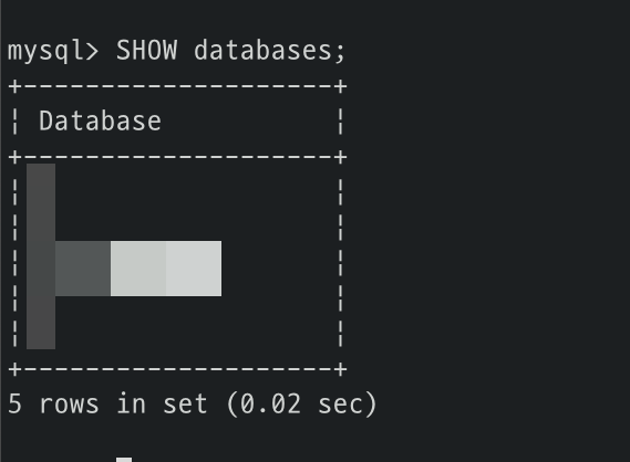 아까 설정한 마스터 암호를 입력하고 접속하면 위와 같이 접근 성공 메시지와 mysql> 이라는 터미널이 뜬다. 이렇게 되면 접근 성공이다!