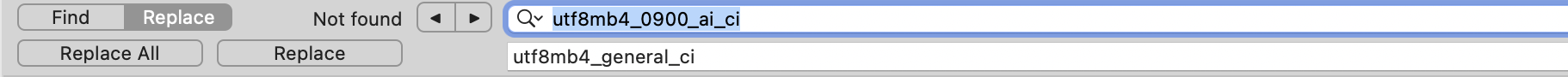 MySQL Workbench에서 해당 부분을 모두 'utf8m64_general_ci'로 변경해준다. 워크벤치의 Replace 기능을 활용하면 훨씬 수월하다.