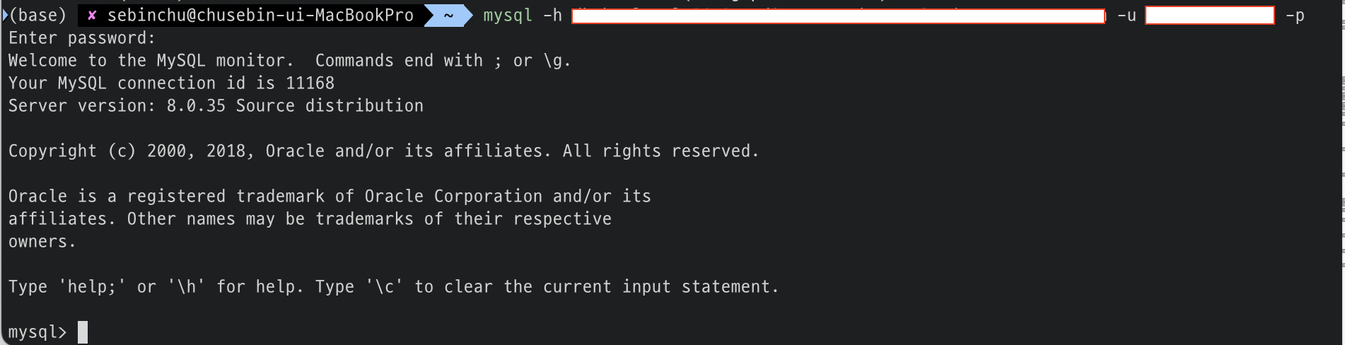mysql -h [endpoint] -u [user명] -P [port번호] -p