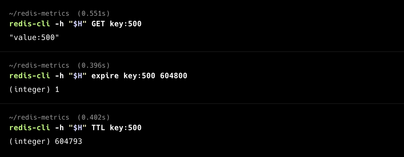 Valkey로 마이그레이션 이후 이 TTL 설정이 잘 남아있는지 확인하기 위해 특정 키(500)에 대해서 TTL(expire)을 설정했다. 초 단위로 TTL을 설정할 수 있기에, 604800초 == 7일로 부여했다.