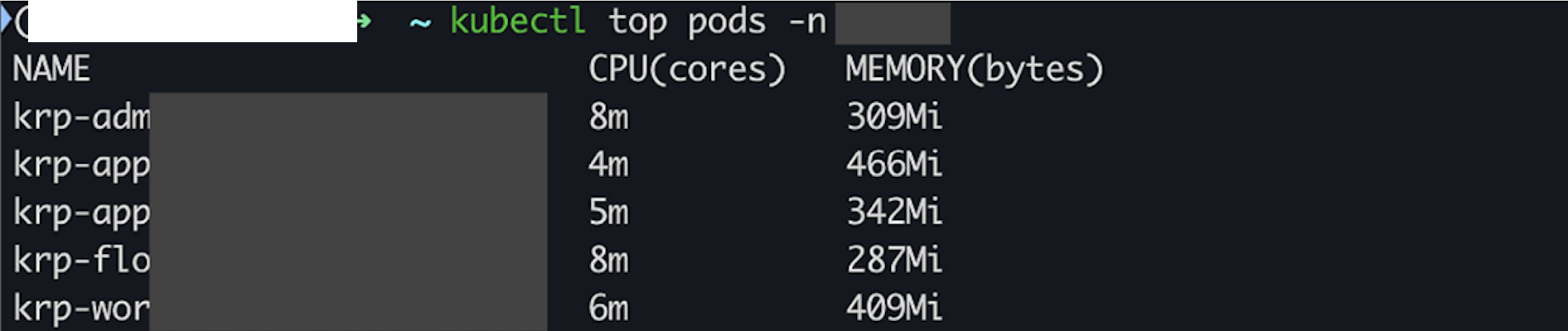 top 명령어를 통해 개별 Pod의 리소스 사용량을 확인할 수 있다. CPU = 8m 이라는 것은 CPU를 0.8% 사용하고 있다는 뜻이다. 만약 CPU에 950m와 같은 수치가 보인다면 한 Pod가 CPU를 95% 사용하고 있다는 뜻으로, 리소스를 비효율적으로 사용하고 있음을 의심해볼 수 있다.