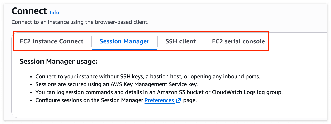 | 항목 | Instance Connect | ⭐️ Session Manager | SSH Client | Serial Console |